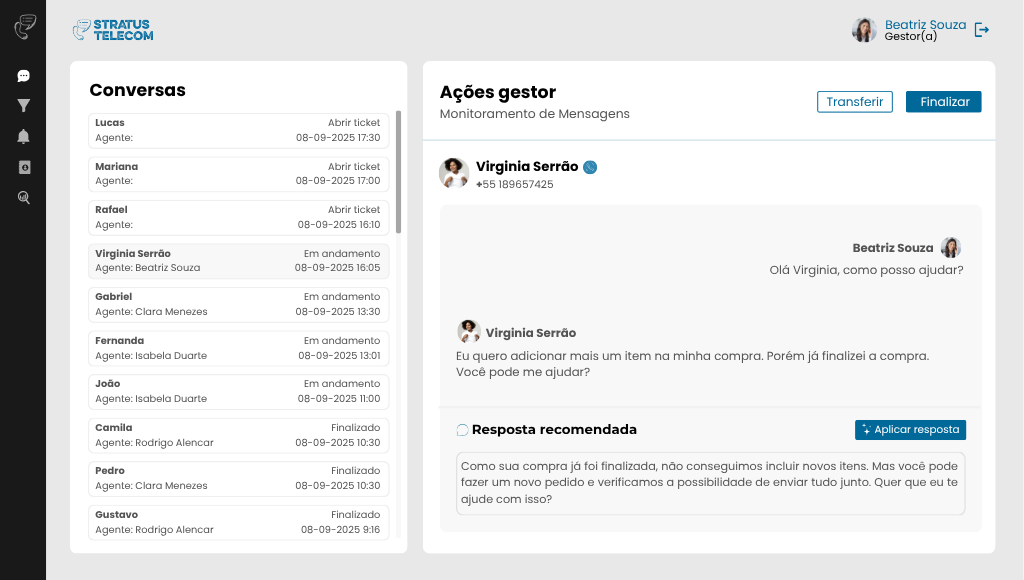 Atenda e envie mensagens por voz ou texto, centralizando toda a comunicação em um só lugar. Controle seu atendimento para que nenhuma solicitação fique sem resposta, acompanhe resultados e ofereça respostas rápidas e eficientes, garantindo a melhor experiência para o cliente.